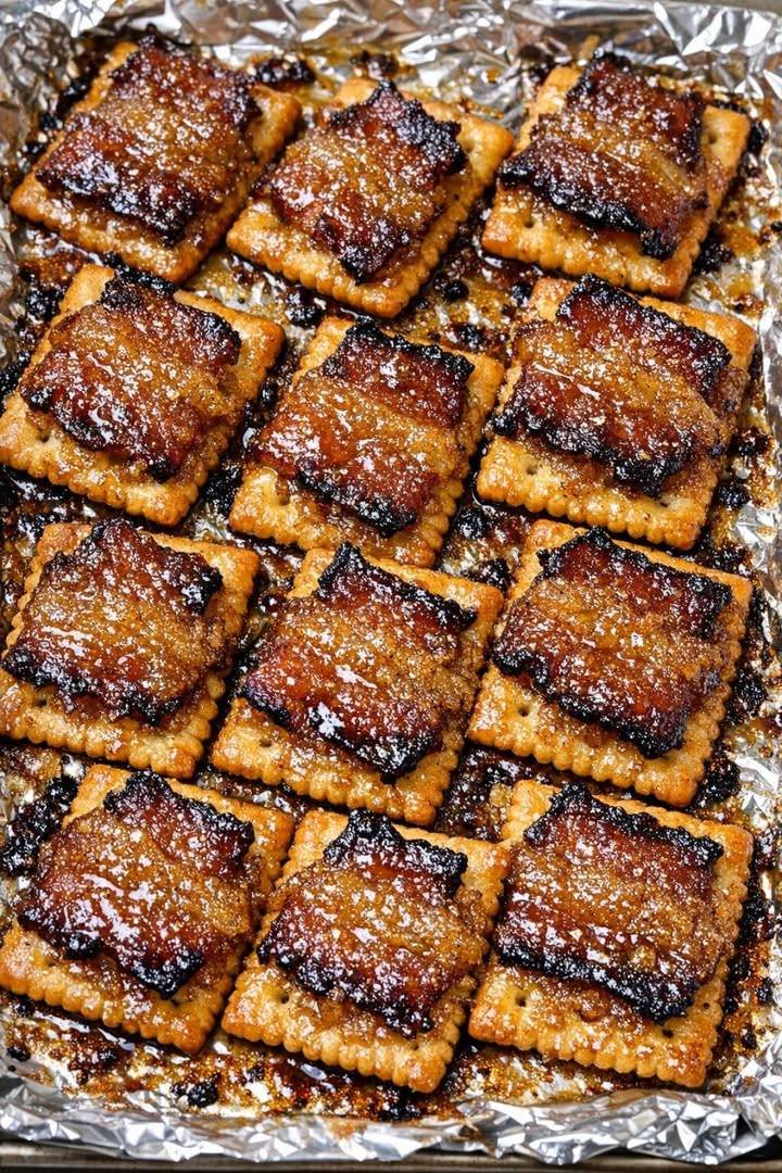 Place the bacon-wrapped crackers on the prepared baking sheet. Bake for 12–15 minutes, or until the bacon is crispy and golden brown.