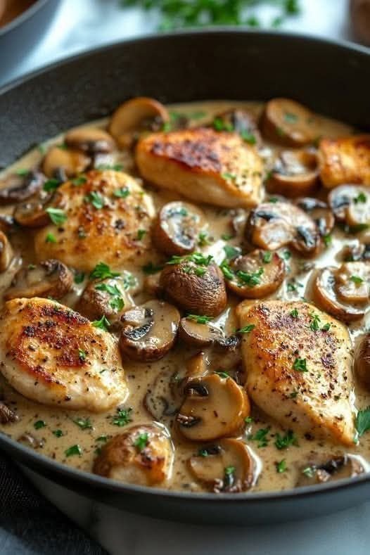 A creamy, comforting dish where tender chicken breasts simmer in a rich mushroom cream sauce. It’s simple enough for weeknights but tastes like a restaurant meal.